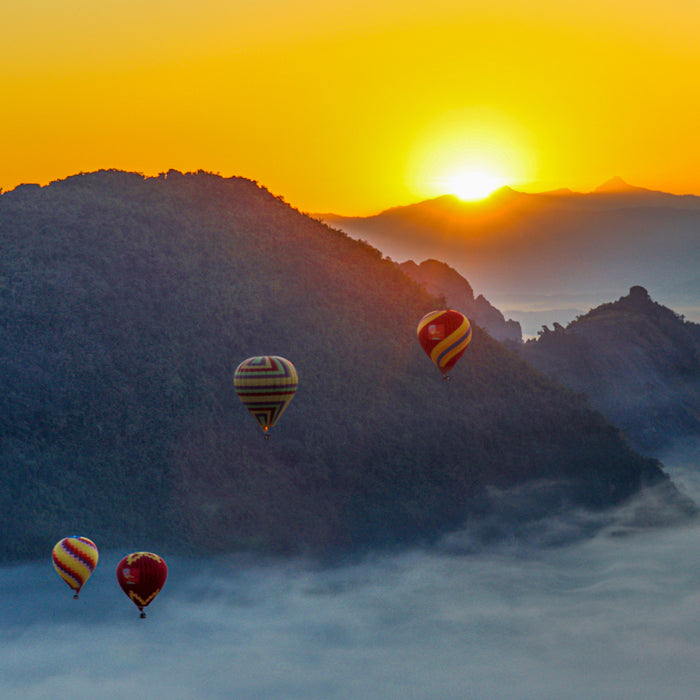 4. Hot Air Ballooning: Take your adventure to new heights with a breathtaking hot air balloon ride over the stunning landscapes of Vang Vieng! Drift serenely through the sky as you gaze down upon rolling rice fields, meandering rivers, and dramatic karst formations. Lose yourself in the beauty of the moment and let your spirit soar with the eagles!