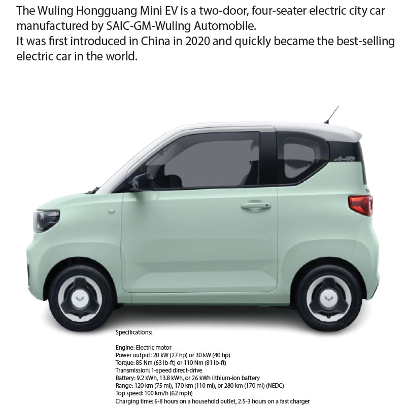 Der Wuling Hongguang Mini EV ist ein zweitüriges, viersitziges elektrisches Stadtauto, das von SAIC-GM-Wuling Automobile hergestellt wird. Es wurde erstmals 2020 in China eingeführt und entwickelte sich schnell zum meistverkauften Elektroauto der Welt.